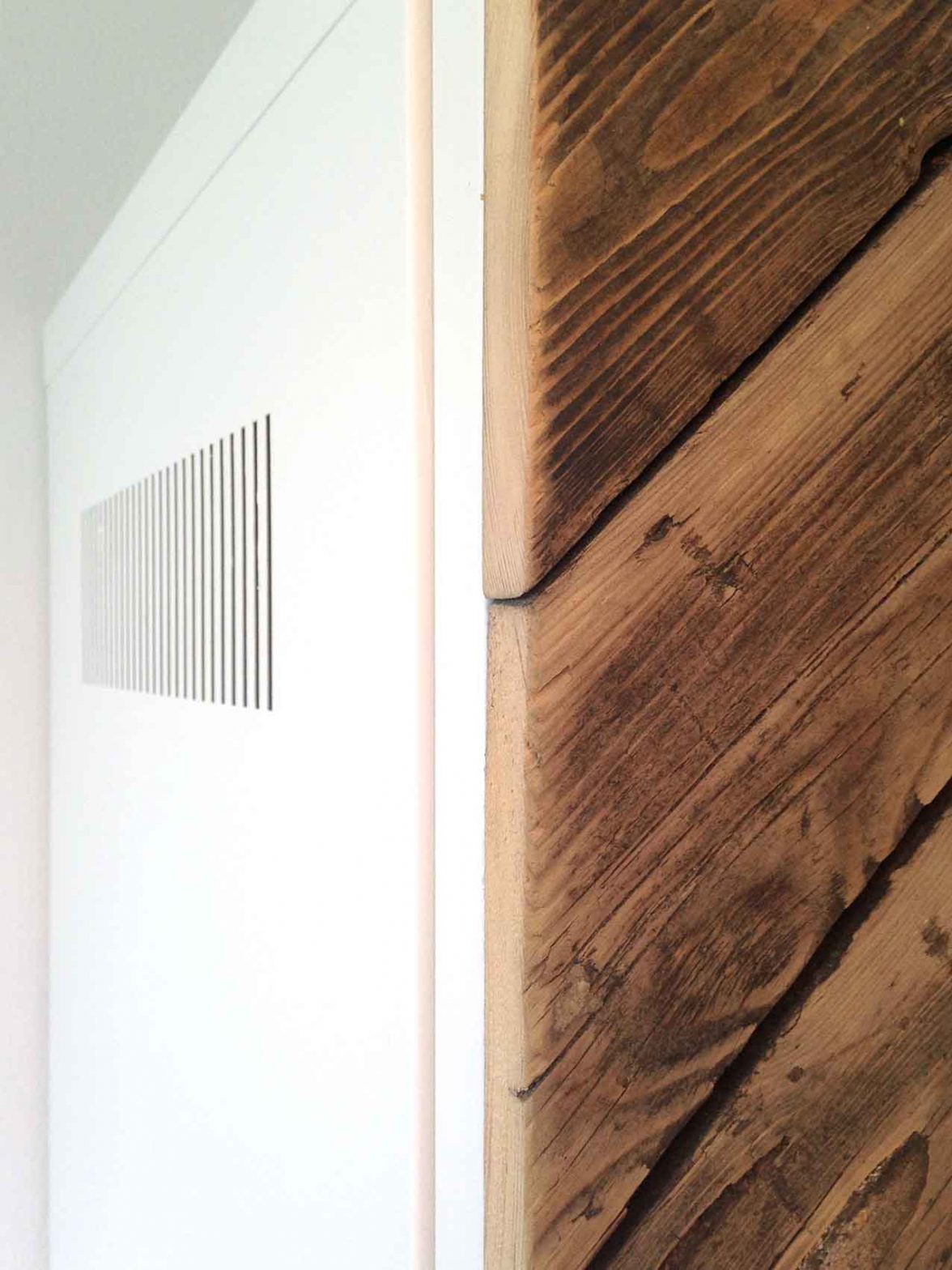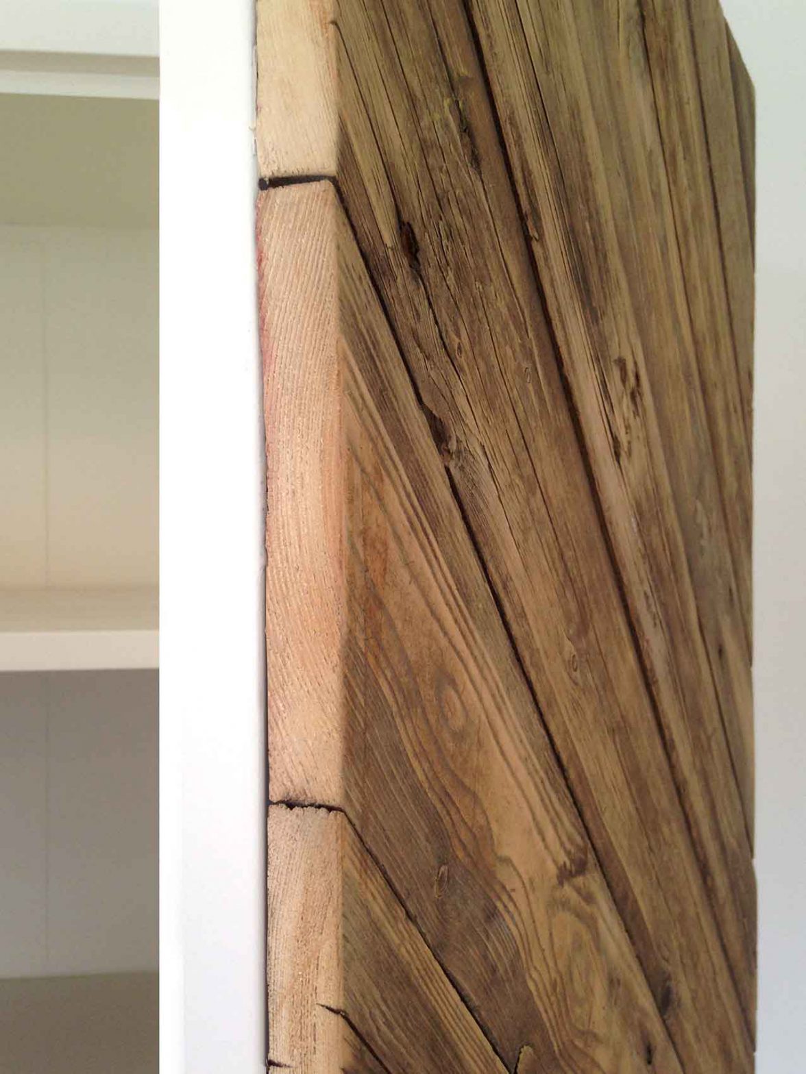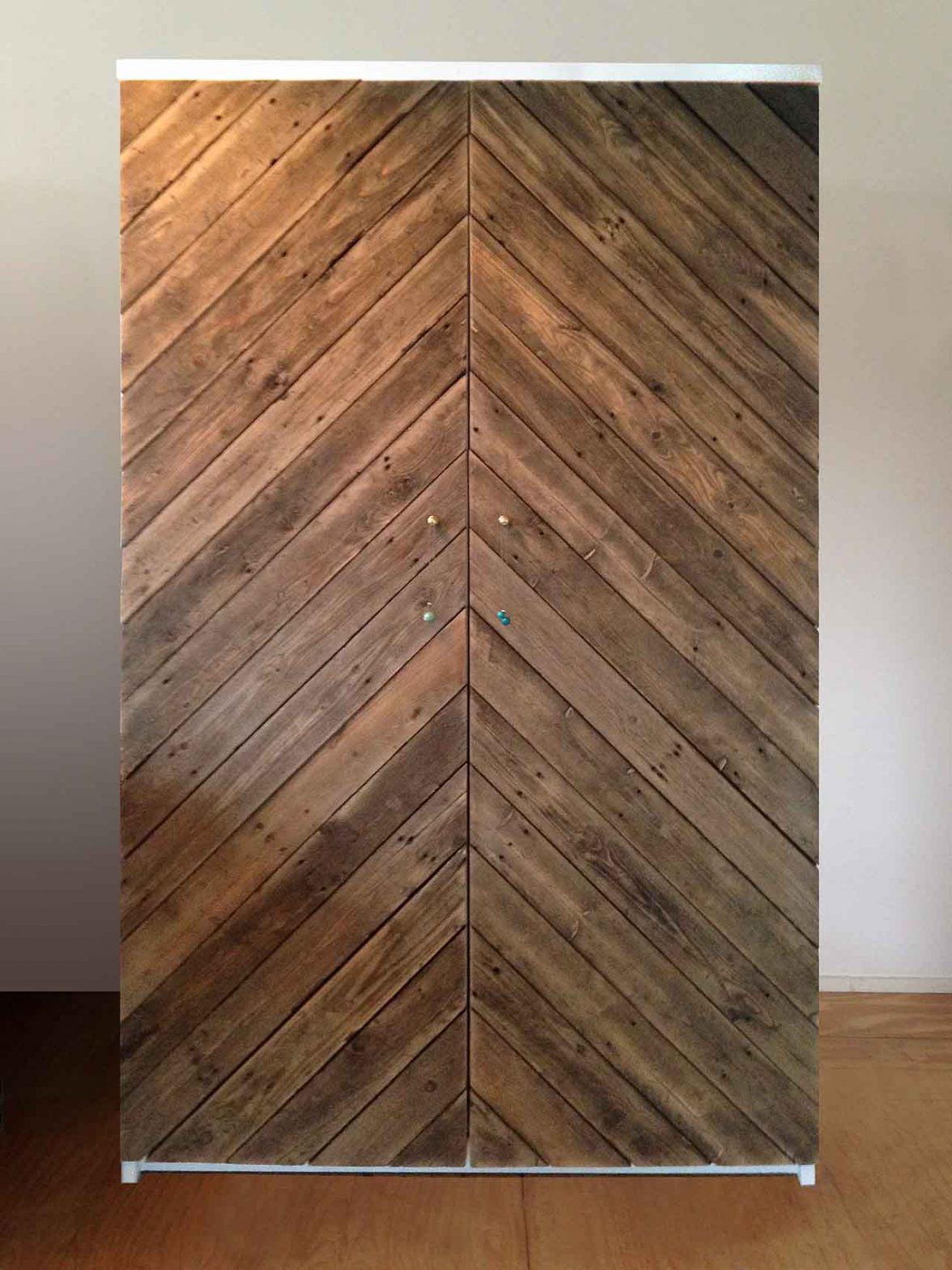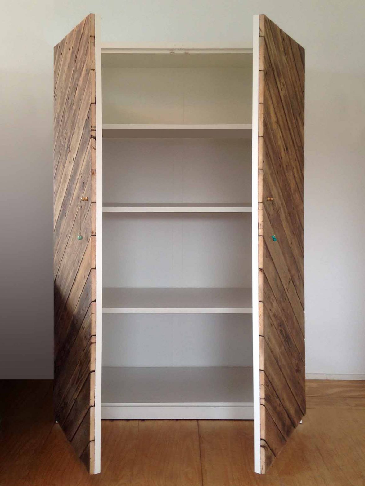 Grote kast met gerecycled hout in visgraatmotief. Lichte archiefkast van gezet plaatmetaal.